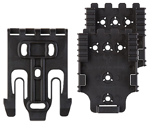 The quick locking system (qls) allows for quick transfer of gear between attachment points such as a belt loop, tactical leg shroud or other stable platform.The qls fork and plate combination passes the level i retention pull test.Constructed of injection molded nylon, the receiver plate can be attached at different angles according to user preference.Hardware and allen wrench included.This qls kit includes one qls 19 locking fork and two qls 22 receiver plates in black.